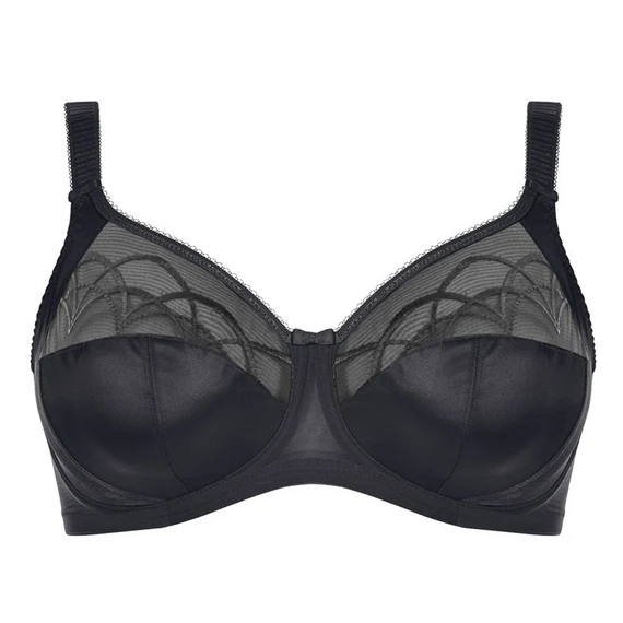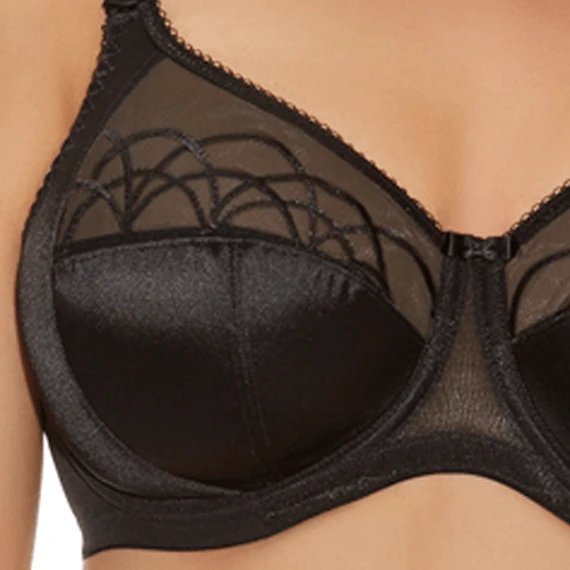 Der Cate-Bügel BH von Elomi ist in schwarz gefertigt. Dieser BH hat schöne Stickereien auf den Cups. Zwischen den Cups und an den Trägern wurden niedliche Schleifen eingearbeitet. Dieser BH bietet dank der dreiteiligen Cups und dem robusten Stretchgewebe, das auch im Band des BHs eingearbeitet ist, eine gute Unterstützung für Ihre Oberweite. Auf diese Weise werden nicht nur die Unterseite, sondern auch die Seiten der Brüste gut unterstützt.