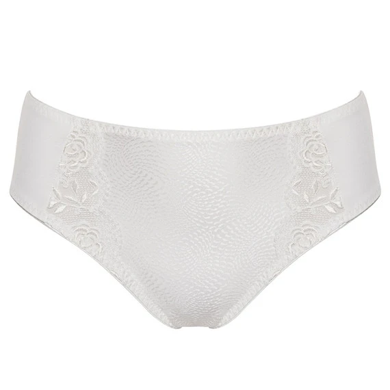 Der Ella Slip von Ulla ist in der Farbe Ecru gehalten. Der ecrufarbener Slip ist auf der Vorderseite mit Tüll mit Blumenstickerei verziert. Der Slip hat eine normale Passform und bedeckt das Gesäß vollständig. Kombinieren Sie diesen Slip mit einem der passenden BHs.