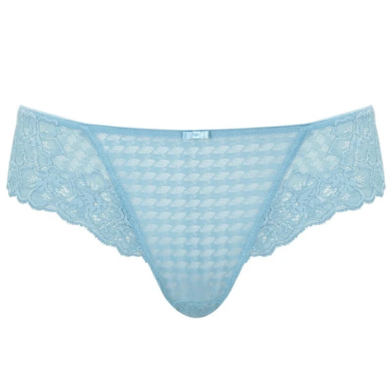 Der Envy Brazilian Slip kommt in der Farbe Sky Blue. Der blaue Slip ist aus robustem Material mit eingewebtem Rattenfänger-Muster. Die Seite und der Rücken sind mit einer blauen Blumenstickerei verziert. Kombinieren Sie diesen Slip mit dem passenden Envy-BH.
