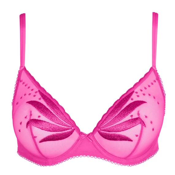 Der Etoile Plunge BH von Marie Jo kommt in der Farbe Cactus Flower. Dieser rosafarbene BH feiert ein Comeback aus den Achtzigern! Die transparenten Tüll-Cups sind mit einem abstrakten Blattmotiv verziert und verleihen dem BH ultimative Retro-Vibes. Die leicht durchscheinenden Materialien lassen die Brust sichtbar werden. Die Körbchen zentrieren die Brüste und die vertikale Naht an den Körbchen hebt die Brüste dezent an und gibt ihnen eine natürliche runde Form. Zwischen den Cups und an den Schulterträgern sind süße Perlen angebracht. Kombinieren Sie diesen BH mit einem der passenden Slips.