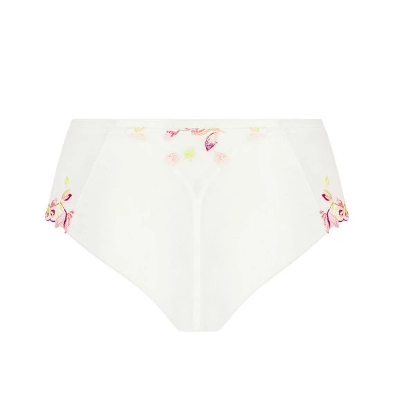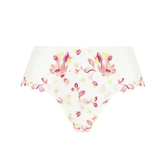 Die Folie D’été Hotpants von Lise Charmel kommen in der Farbe Folie Solaire. Diese verspielten, tief ausgeschnittenen Slips sind vom Modell der Boxershorts inspiriert, aber mit einem femininen Twist. Die Seiten bestehen aus transparentem Tüll, der mit einer mehrfarbigen Blumenstickerei in sommerlichen Farben verziert ist. Vorne ist ein zartes Spitzendreieck angebracht, das einen eleganten Akzent setzt. Der Rücken ist aus doppelt gefaltetem Tüll, der für einen glatten Abschluss sorgt, mit einem Spitzeneinsatz und einem weichen Bund. Ein gesticktes Blumenmuster auf der linken Seite macht es verspielt und einzigartig. Kombinieren Sie diese Hotpants mit dem passenden Bügel-BH für ein farbenfrohes, sommerliches Set.