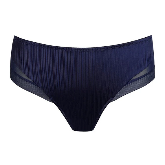 Der Knokke Slip von Primadonna Twist kommt in der Farbe Sapphire Blue. Dieser blaue Slip besteht aus einem glänzenden Satin-Stoff, der mit einem einzigartigen Liniendruck versehen ist. Durch die nahtlose Verarbeitung trägt sich dieser Slip unsichtbar unter der Kleidung. Die Netzeinsätze an den Seiten sind leicht durchscheinend. Kombinieren Sie diesen Slip mit einem der passenden BHs.
