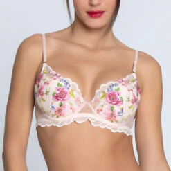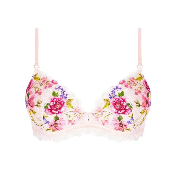 Der Libertine en Fleurs Preformed Bra von Lise Charmel kommt in der Farbe Libre Eclosion. Dieser luxuriöse T-Shirt-BH verfügt über vorgeformte Cups, die mit einer farbenfrohen Blumenstickerei verziert sind, die dezent über die glatten Cups verläuft. Die seitlichen Tülleinsätze mit Wellenkanten sorgen für einen raffinierten Abschluss. Zwischen den Cups befindet sich ein dekoratives Detail aus transparentem Tüll mit einem glitzernden Stein, der für einen eleganten Touch sorgt. Die Schulterträger sind mit goldenen Ringen verziert, die einen besonders luxuriösen Touch verleihen. Kombinieren Sie diesen BH mit einem der passenden Slips für ein komplettes, romantisches Set