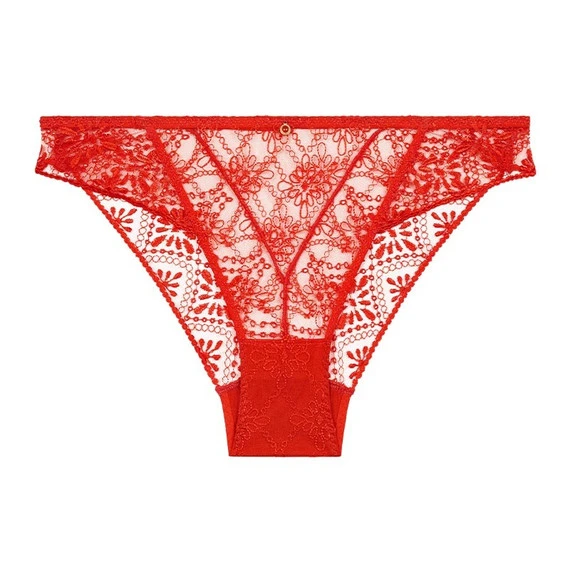 Der Losing My Mind-Slip von Aubade kommt in der Farbe Chile. Dieser orangefarbene Slip ist eine Ode an die pure Verführung und unwiderstehliche Eleganz. Der Slip ist mit einer zarten Stickerei auf einem leicht durchscheinenden Tüllgrund verziert. Der Slip bedeckt teilweise das Gesäß. Das goldene Detail auf der Vorderseite rundet den Slip ab. Kombinieren Sie diesen Slip mit einem der passenden BHs.