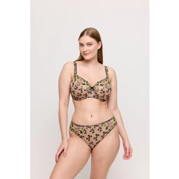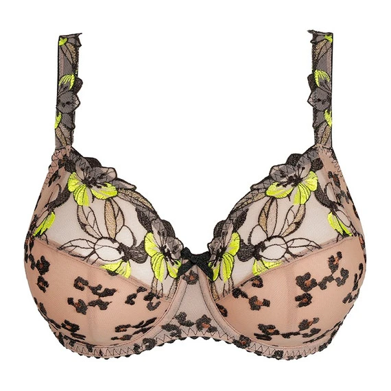 Der Manali Bügel BH von PrimaDonna ist in der Farbe Wild Bloom erhältlich. Dieser beigefarbene BH kombiniert raffinierte Stickereien mit einem gewagten Leopardenmuster und lebhaften Neonblumen, die sich bis zu den Trägern fortsetzen. Die Cups schließen hoch an der Brust, während die halbtransparenten Teile dezent ein Stück Haut zeigen. Dank der dreiteiligen Cups werden die Brüste zentriert und nach vorne angehoben, was für ein wunderschön geformtes Dekolleté sorgt. Zwischen den Cups ist der BH mit einer Schleife verziert. Kombinieren Sie ihn mit einem passenden Slip aus der Manali-Kollektion.