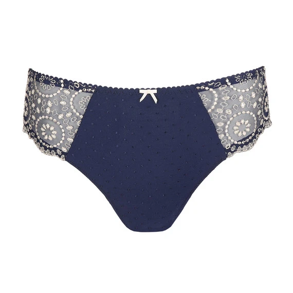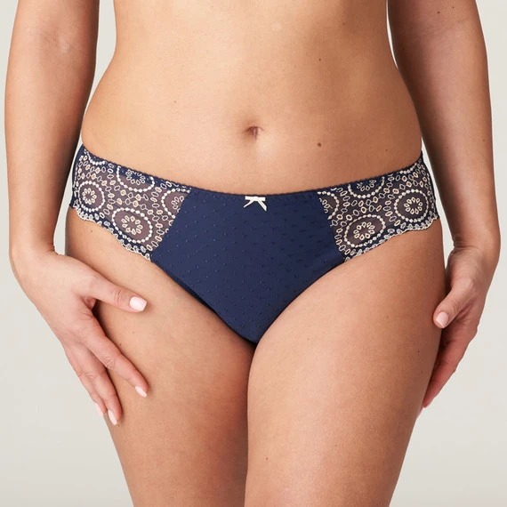 Der Osino Slip von PrimaDonna kommt in der Farbe Sapphire Blue. Feiner Rioslip mit Broderie Anglaise an den Seiten. Sehr dünne Verarbeitung, knittert nicht unter Ihrer Kleidung. Der höhere Beinausschnitt des Rioslips verleiht Ihnen eine elegante Silhouette. Vintage ist wieder da! Mit diesem stilvollen Lochstickerei-Look liegen Sie goldrichtig. Der feine Stoff passt perfekt unter all Ihre Herbstoutfits und fühlt sich herrlich weich auf der Haut an. Vervollständigen Sie Ihren Look mit einem passenden BH aus der Osino-Kollektion.