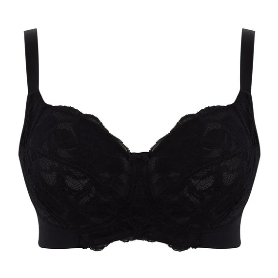 Der Rocha Bralette von Panache ist in der Farbe Schwarz erhältlich. Dieser schwarze Bralette ist komplett mit elastischer Spitze verziert. Die Bralette hat keine Bügel, wodurch sie sich besonders weich und bequem anfühlt. Die festen Cups stützen den Busen und zentrieren ihn zur Mitte hin für ein schönes Dekolleté. Kombinieren Sie dieses Bralette mit dem passenden Slip.
