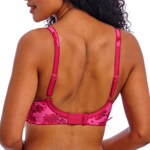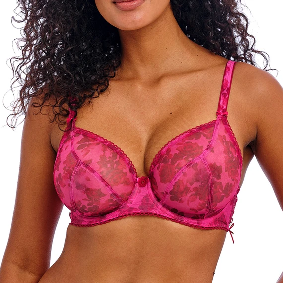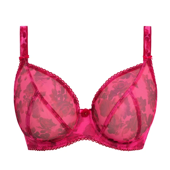 Der Rose Blossom Plunge BH von Freya kommt in der Farbe Red Rose. Dieser rosafarbene BH hat feste Tüll-Cups, die mit einem schönen Rosenprint verziert sind. Die leicht durchscheinenden Materialien verleihen dem BH einen sexy Look. Die festen Cups stützen und zentrieren die Brüste für ein verführerisches Dekolleté. Zwischen den Cups ist der BH mit einer Rose verziert und die Ränder des BHs sind mit einer Zierborte versehen. Die Stickerei an den Schulterträgern rundet den BH ab. Kombinieren Sie diesen BH mit einem der passenden Slips.