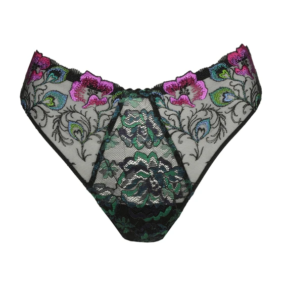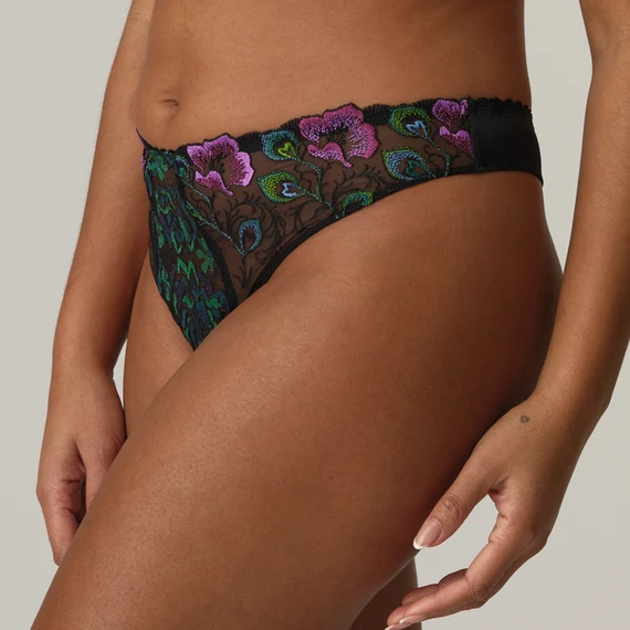Der San Angel von PrimaDonna kommt in der Farbe Peacock Feather. Dieser schwarze String ist mit einer schönen bunten Blumenstickerei verziert. Der hohe Beinausschnitt lässt die Beine optisch länger erscheinen. Kombinieren Sie diesen String mit einem der passenden San Angel-BHs.