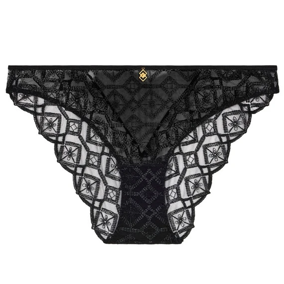 Der Sense Of Illusion Slip von Aubade kommt in der Farbe Schwarz. Der aus nachhaltigen, recycelten Materialien hergestellte schwarze Slip kombiniert ein modernes, grafisches Design mit raffinierten, verführerischen Details. Die subtile Transparenz des Tülls, die Stickereien und die goldenen Akzente sorgen für einen luxuriösen und sinnlichen Look. Der Slip hat eine normale Passform und bedeckt teilweise das Gesäß. Kombinieren Sie diesen Slip mit einem der passenden BHs und Strapse für ein komplettes Set.