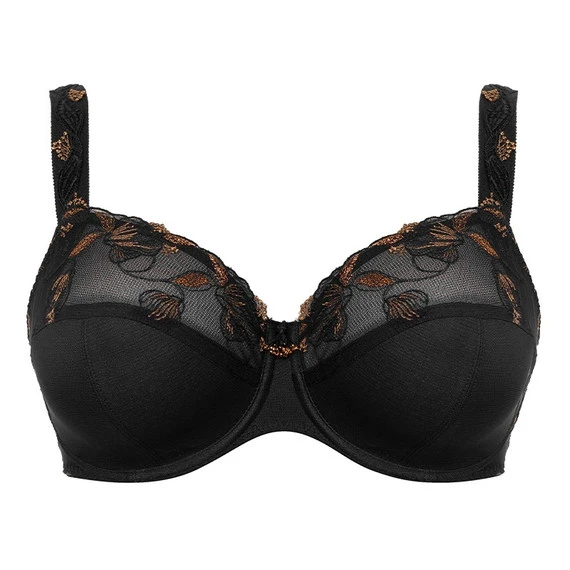 Der Ulla Full Cup BH von Ulla kommt in der Farbe Schwarz. Dieser schwarze BH hat feste, nicht vorgeformte Cups, die die Brüste gut stützen. Die Oberseite der Cups ist aus transparentem Tüll, der mit einer bronzefarbenen Blumenstickerei verziert ist, die sich über die Schulterträger fortsetzt. Die Körbchen umschließen die Brüste vollständig und heben sie nach vorne, um sie zu zentrieren und eine perfekt runde Form zu erhalten. Durch die hochgeschlossenen Cups ist der BH auch bei großen Körbchengrößen sehr angenehm zu tragen. Die Schleife zwischen den Cups rundet den BH ab. Kombinieren Sie diesen BH mit einem der passenden Slips.