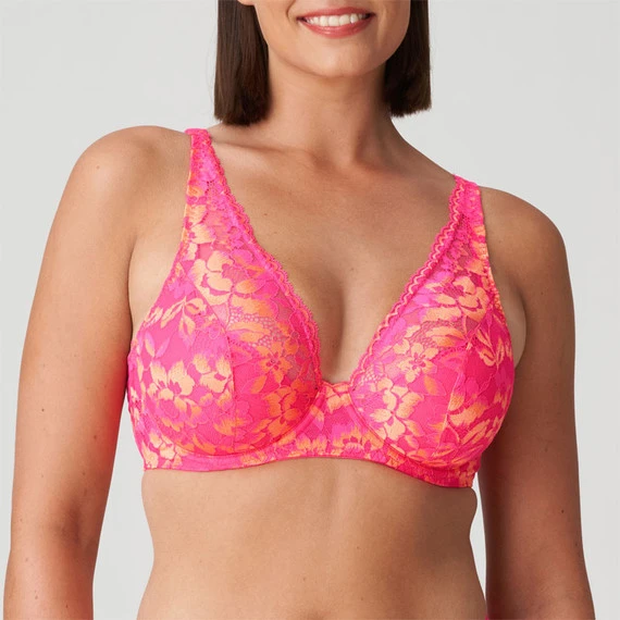 Der Verao Bügel BH von PrimaDonna Twist kommt in der Farbe L.A. Pink. Dieser auffallend rosafarbene BH ist mit orangefarbener, floraler Spitze verziert, zu schön, um sie zu verstecken! Der Farbverlauf lässt die Farben schön miteinander verschmelzen. Die getauchten Körbchen sind leicht gepolstert und geben dem Busen eine schöne runde Form. Die leicht durchscheinende Spitze am oberen Rand der Cups verleiht dem BH einen verführerischen Look. Die halbtransparenten Schulterträger vervollständigen den BH. Kombinieren Sie diesen BH mit einem der passenden Slips.